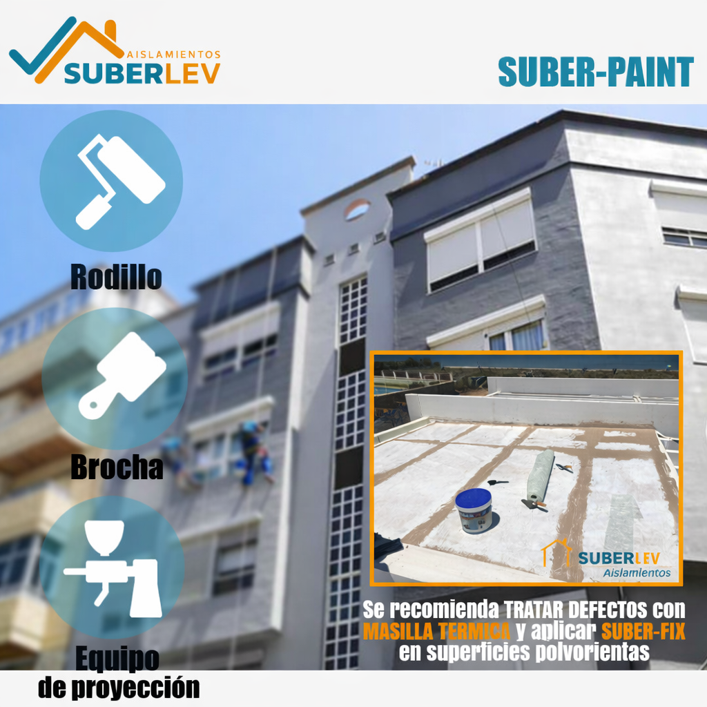- Preparación de la Superficie: Asegúrate de que la superficie esté estable, limpia, seca y sin polvo. Sanea áreas degradadas, aplica Masilla Térmica para defectos y Suber-Fix en superficies polvorientas.