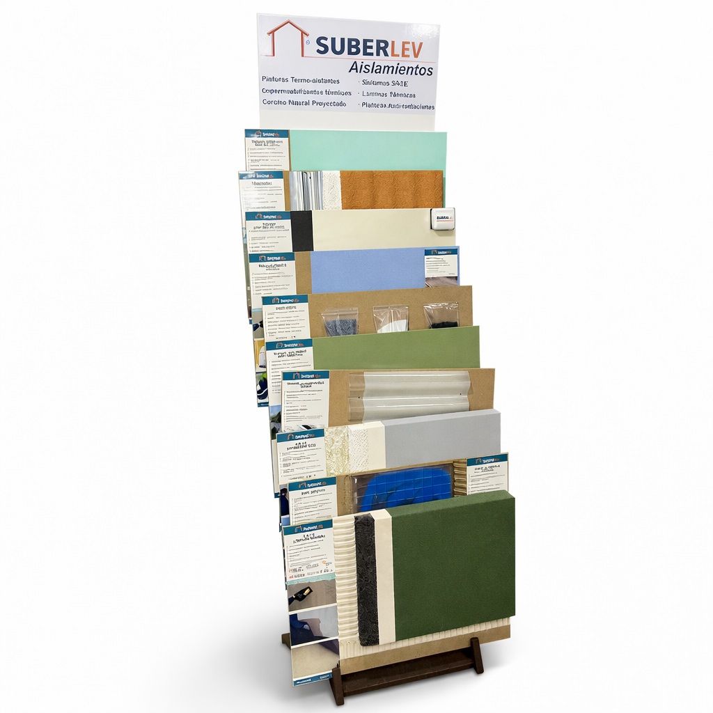 El Mueble Pirámide es una estructura de madera diseñada para exhibir 9 muestras de gran formato de nuestros productos. Ideal para mostrar revestimientos, aislantes y otros materiales, este mueble combina funcionalidad y diseño, permitiendo una presentación clara y organizada.